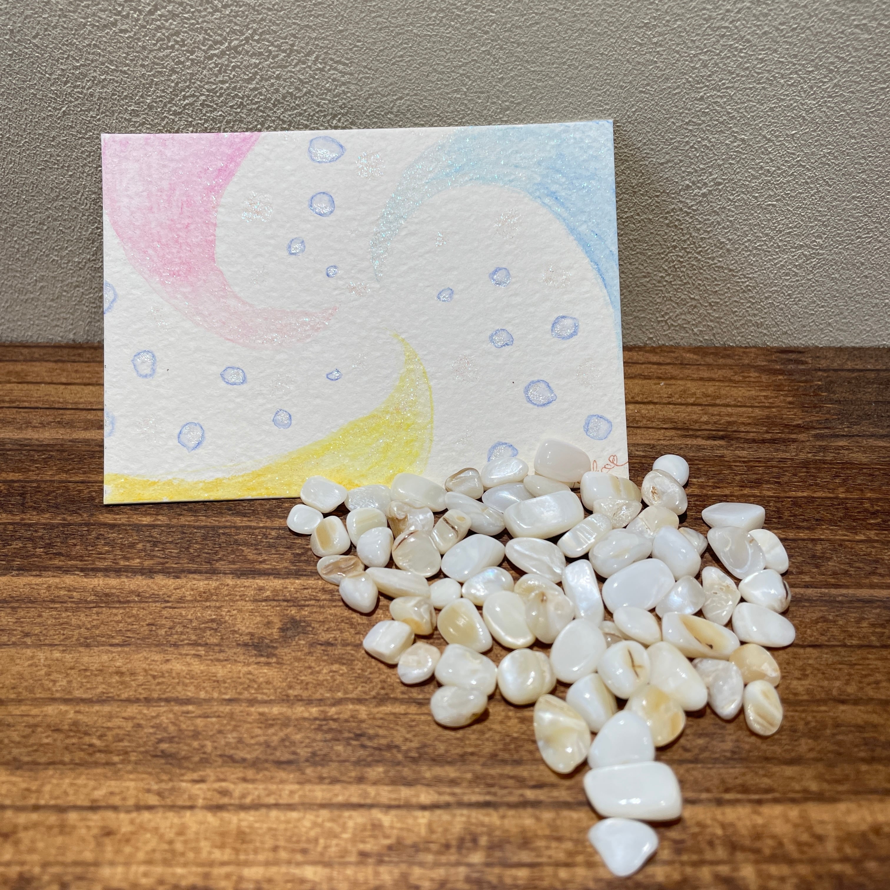 「同じ場に絵と石を置くことで共震が産まれ、あなた、そしてあなたのいる場所を守る」と意図しています。